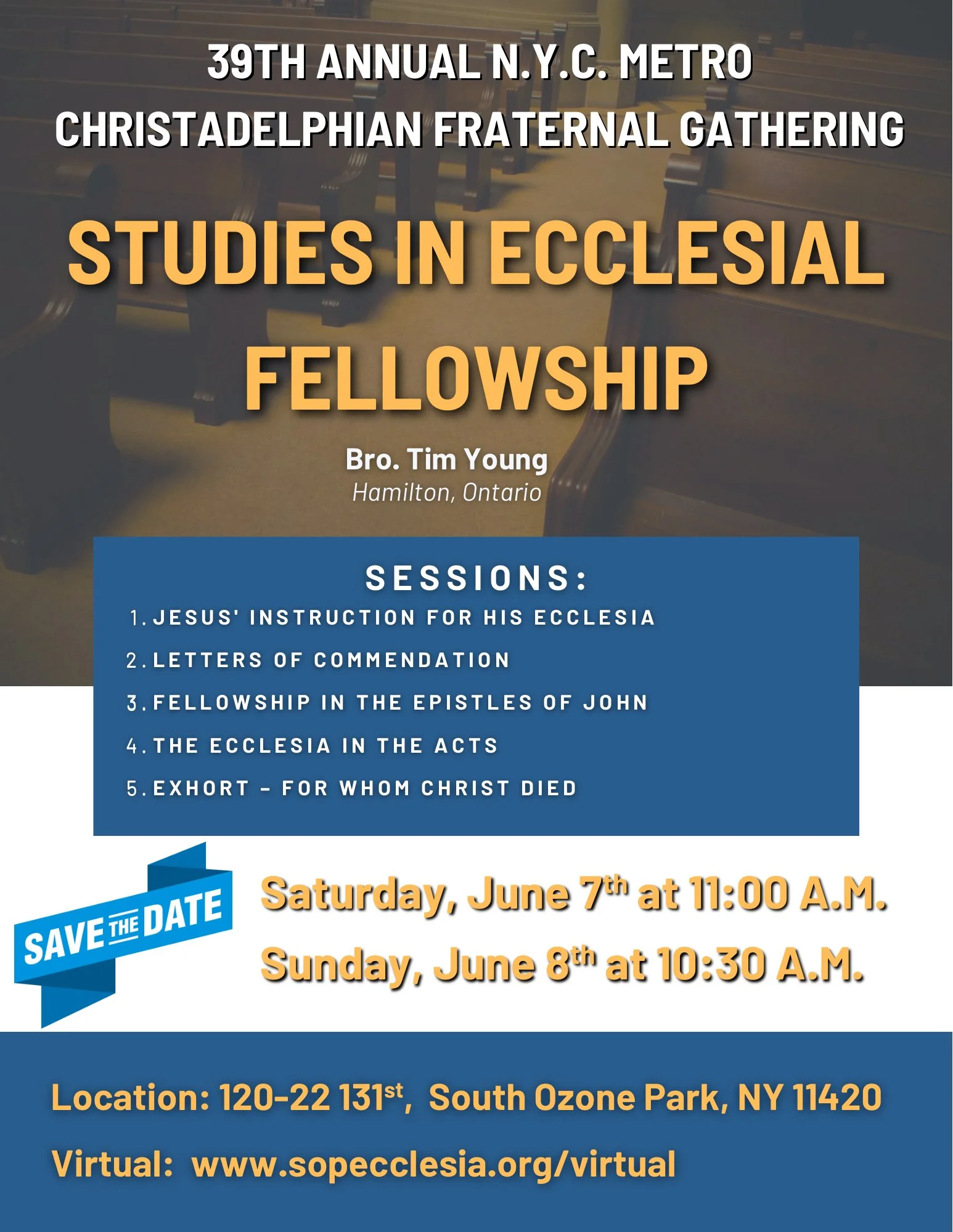 Includes Hymns, Prayers, Sermon, and Communion (for baptized brothers and sisters).